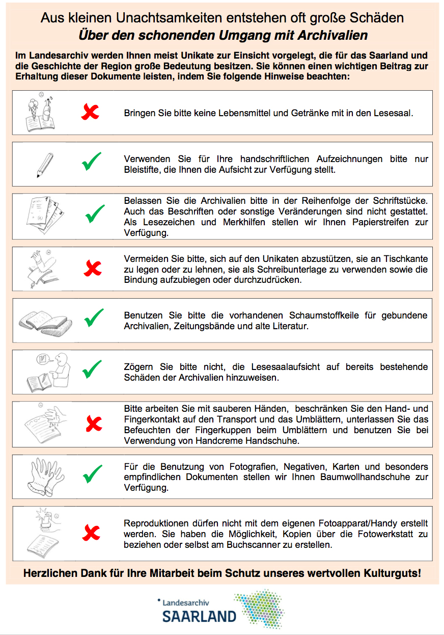 Um den Benutzern im Lesesaal immer wieder die wichtigsten Verhaltensregeln vor Augen zu führen, bietet es sich an, ein einseitiges Merkblatt mit aussagekräftigen Abbildungen und kurzen Texten zu entwickeln. Orientieren Sie sich bei den Hinweistexten an Aufgabe 4A . Erstellen Sie ein solches Merkblatt für Ihren Lesesaal. Das folgende Beispiel steht Ihnen als Vorlage zum Download zur Verfügung.